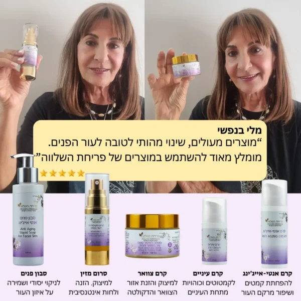 אני משתמשת בקרם העיניים, קרם הפנים, הסרום, קרם הצוואר וסבון הפנים – והתוצאות פשוט מדהימות! העור נראה חלק, רענן ומלא זוהר. הקרמים מעניקים לחות ומיצוק, הסרום נספג נהדר, וסבון הפנים מנקה בעדינות בלי לייבש. אחרי כמה שבועות של שימוש, אני רואה שיפור משמעותי בקמטוטים ובמרקם העור. ממליצה בחום!