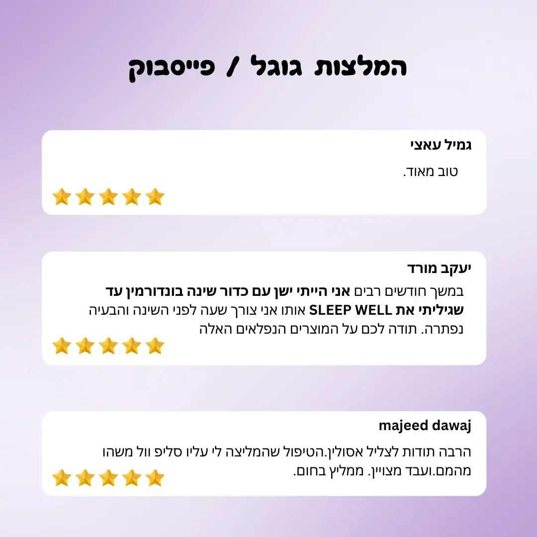 אחרי הרבה לילות עם בעיות שינה. ישנתי בלילה כל כך טוב מהפעם הראשונה שלקחתי את קפסולת הצמחים שקניתי מימכם .הופתעתי כמה ישנתי טוב .ברוך ה' .אני כל כך מרוצה. ברוך ה'. ממליצה מאד .